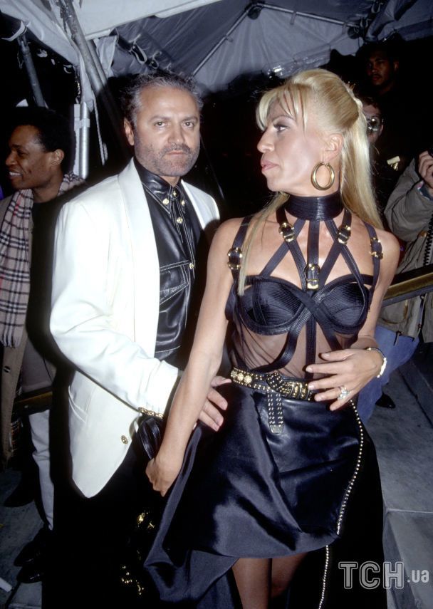 На одной из знаковых вечеринок в Нью-Йорке, которая проходила в публичной библиотеке, Донателла Версаче привлекла всеобщее внимание в наряде, который был создан ее братом. Черный топ с высокой горловиной с прозрачной вставкой и асимметричная кожаная юбка с драпировкой, декорированная мощным логотипом в виде Медузы Горгоны, стали не просто модным решением, а настоящим заявлением о женской силе и сексуальности. Эстетика образа дополнялась золотыми украшениями и ярким макияжем, что придавало ему дополнительную изюминку.